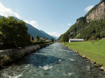 Nous suivons d’abord le torrent Muota - un spectacle naturel à lui seul. Dans le village, il coule cependant de façon très rectiligne, façonné par l’homme. De ce côté de la rivière, on perçoit particulièrement bien l'ensemble du centre historique du village autour de l’église. Le couvent des Minorites se présente aussi avec élégance. La petite communauté de sœurs recueille également en ligne les intentions de prière.