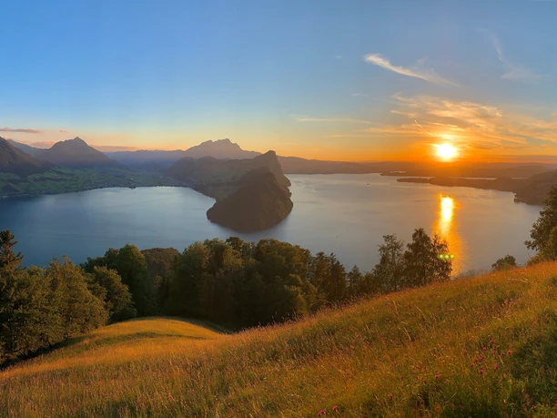 D'abord, nous marchons sur la route de montagne jusqu'à Oberried, où un chemin agricole part à gauche en passant par Lücken. Dès ici, on peut déjà admirer le premier panorama sur Gersau, le lac et les montagnes – un vrai régal pour les yeux.
