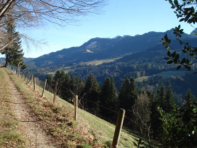 De l’arrêt Rössli à Schwarzenberg, l’itinéraire vous conduit d’abord, plus bas, à Ennenmatt et Bochslig, puis brièvement le long du cours supérieur idyllique du Chesselbach, avant de remonter vers Niederlehn et, par le Stutzwald, à Dieterschwandweid. Il y a une variante un peu plus courte, mais moins diversifiée: après Vortig, vous pouvez suivre la petite rue du bas jusqu’à Dieterschwand, puis Dieterschwandweid. Après une brève montée qui vous fait passer par Hof Obergütschweid, vous atteignez d’abord un ravissant point de vue, puis, la pointe la plus occidentale de cet ancien circuit, d’où le regard porte sur le Plateau et la gorge de la Rümlig et même jusqu’à l’Entlebuch voisin. Le parcours vous conduit à présent, en direction du sud-est, à Büelweid puis à Büel, et plus tard à Schirgen et Hinteregg. Un crochet jusqu’au point de vue d’Arnenhubel est également recommandé. Enfin, vous reviendrez à Schwarzenberg via Teufsite.