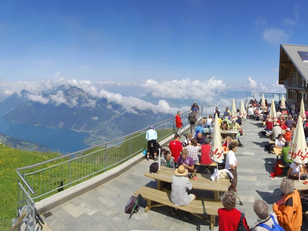 Depuis le village de montagne Stoos, on traverse le village en direction de Fronalpstock. De là , vous prenez le télésiège jusqu'au sommet du Fronalpstock. Au Fronalpstock, profitez depuis la terrasse ensoleillée du restaurant unique du sommet du panorama spectaculaire sur dix lacs et d'innombrables sommets de montagnes.
