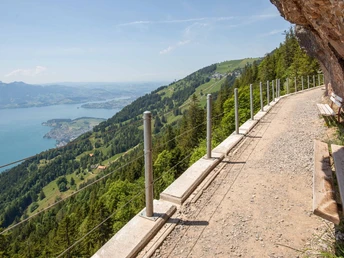 Une grande partie du chemin traverse de riches alpages. À partir de Rigi First, 12 panneaux d'information donnent un aperçu de la biodiversité et des trésors naturels de la Rigi. Favorisée par la composition rocheuse, l'histoire naturelle et le climat doux du lac, une riche flore et faune s'est développée côté sud de la Rigi. Depuis Rigi Unterstetten, une courte montée mène au Seeweg, qui descend toujours en direction de Hinterbergen via la Glettialp. Le lac des Quatre-Cantons avec ses baies reconnaissables s'étend à vos pieds. Depuis Hinterbergen, le téléphérique vous ramène à Vitznau.