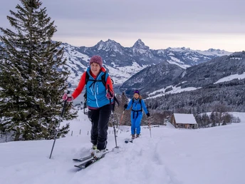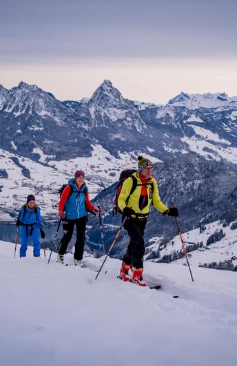 Des pentes dégagées marquent la montée jusqu'au Twäriberg. Ici, le paysage change, la trace mène à une crête prononcée et aérienne, au loin se trouvent les maisons de Goldau et le lac de Zoug. Par temps clair, la vue atteint les Vosges. L'anticipation d'une soupe fumante dans le restaurant d'altitude confortable et d'une descente récompensante dans une poudreuse tourbillonnante apparaît. Si seulement il y avait plus de ces jours d'hiver profond !