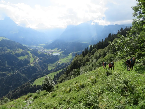 Après un bon petit-déjeuner, tu traverses le village jusqu'à la Brändlen-Bahn. Après la montée, un court ascension mène à Schmiedsboden, puis le prochain Buiräbähnli descend vers Oberrickenbach. De là, une courte marche mène à la station de la vallée Fell, où deux téléphériques te conduisent confortablement à l'Alp Sinsgäu. Une fois en haut, la randonnée continue à pied vers Bannalp, puis par le charmant sentier Walen jusqu'à l'Alp Oberfeld, la destination de l'étape.