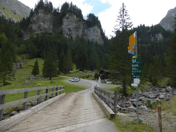 Le point de départ est le Sahliboden, ensuite à gauche via le pont du Ruosalperbach. Suivre la route naturelle jusqu'au point 1280. Tourner à gauche et suivre le chemin balisé via Läcki jusqu'à Chneu. Puis à travers les sauvages Chrümpfen, monter jusqu'à Mütschen et à la destination Glattalp.
