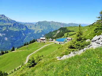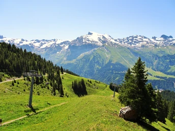 Vous pourrez donc entamer le chemin du retour avec une nouvelle énergie. Vous resterez en altitude jusqu’à Rosenbold. Au point de vue, un conseil: sortez votre appareil photo et jetez un coup d’œil sur le panneau décrivant le décor montagneux. Un tel panorama n’est pas monnaie courante. À partir de là, le sentier ne fait que descendre jusqu’au point d’arrivée de la randonnée, le Berglodge Ristis. Le retour au village se fait par train et bus.