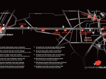 Promenez-vous sur le Tellsweg depuis la gare jusqu'au centre d'Altdorf. Vous vivrez la légende du héros suisse de la liberté Guillaume Tell, sa genèse et son impact. Et vous découvrirez un village vivant, où l'histoire et le présent se mêlent avec légèreté. Le Tellsweg mène de la gare au cœur du village d'Altdorf. Pour le parcours d'un kilomètre et demi, plat, une demi-heure suffit en vitesse rapide. Mais qui voudrait se presser lorsqu'il y a une histoire passionnante à vivre – et plein de jolis endroits pour s'attarder.