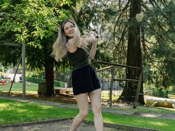 But trou Rigiblick : Tronc d'arbre La cible est le tronc ! Fais attention aux autres – parfois des gens reviennent de la pelouse. En cas d'herbe haute, marche sur le bord – ainsi ce sera agréable pour tous.