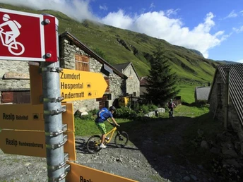 Depuis la gare d'Andermatt, le parcours mène en direction de Bäzberg. Commence bientôt la première montée raide qui récompense les cyclistes par une magnifique vue sur Andermatt. Après une courte descente, on roule sur un chemin initialement en gravier qui devient unfluide sentier de rive jusqu'à Realp. Peu après, on passe devant la gare du train à vapeur Furka-Bergstrecke. La route cyclable continue vers Schweig dans la vallée Witenwasserental, un beau singletrail ramène à Realp. Jusqu'à Zumdorf, on roule le long du sentier de rive, puis on continue par la route principale jusqu'à Hospental. Juste à l'entrée du village, un sentier étroit part en direction de l'ancien tour. Le retour à Andermatt se fait le long de la Reuss. À l'entrée du village, la montée vers Flies commence à droite et il faut affronter les dernières rampes raides du parcours. En récompense, suit une courte mais fluide descente par sentier jusqu'à Rohr dans la vallée Unteralptal. Le retour à Andermatt se fait par la route alpine.