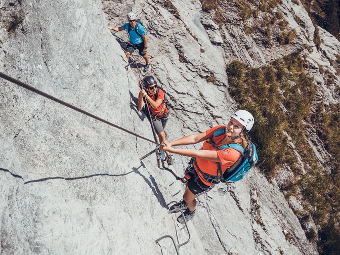 Nous escaladons les fortes pentes herbeuses sous la paroi rocheuse (partiellement sécurisées). Une première courte traversée vers la gauche (B) nous mène à une échelle (A/B). Suit une vire facile à parcourir (B) et quelques courtes montées (A/B), avant d'atteindre une étroite cheminée (A). Nous suivons facilement les sécurisations par câble jusqu'à une vire (A) et arrivons à un banc où nous pouvons faire une pause et profiter de la vue. Par une échelle (A/B), nous atteignons une autre longue vire (A) qui se transforme à l'arrière en un passage de marche non sécurisé. Nous grimpons à côté d'une tour rocheuse (A/B) jusqu'à un système d'échelles (B/C) qui nous mène à une arête. Ensuite, nous traversons brièvement une dalle impressionnante (A) et suivons les sécurisations par plusieurs échelles en montant (B/C, puis A/B) jusqu'au registre et à la caisse. Après un autre banc, cinq échelles (B) montent une arête raide jusqu'à la sortie au « Freschkopf » dans un champ de cailloux.