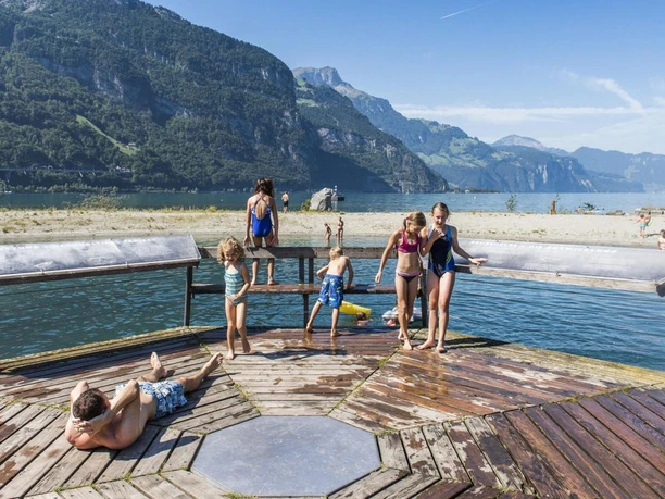 Ma non bisogna trascurare nemmeno la spiaggia di ciottoli e pietre ai margini del sentiero: Un pontile con una piattaforma panoramica circolare conduce un po' più in là nel lago. Chi non vorrebbe tuffarsi da lì nel rinfrescante Lago dei Quattro Cantoni?